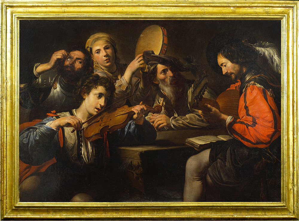 Valentin de Boulogne, copia coeva da Coulommiers 3 gennaio 1591 - Roma 19 agosto 1632 101,6x147,3 cm. "Concerto con quattro suonatori ed un bevitore", olio su tela, entro cornice coeva in legno dorato.