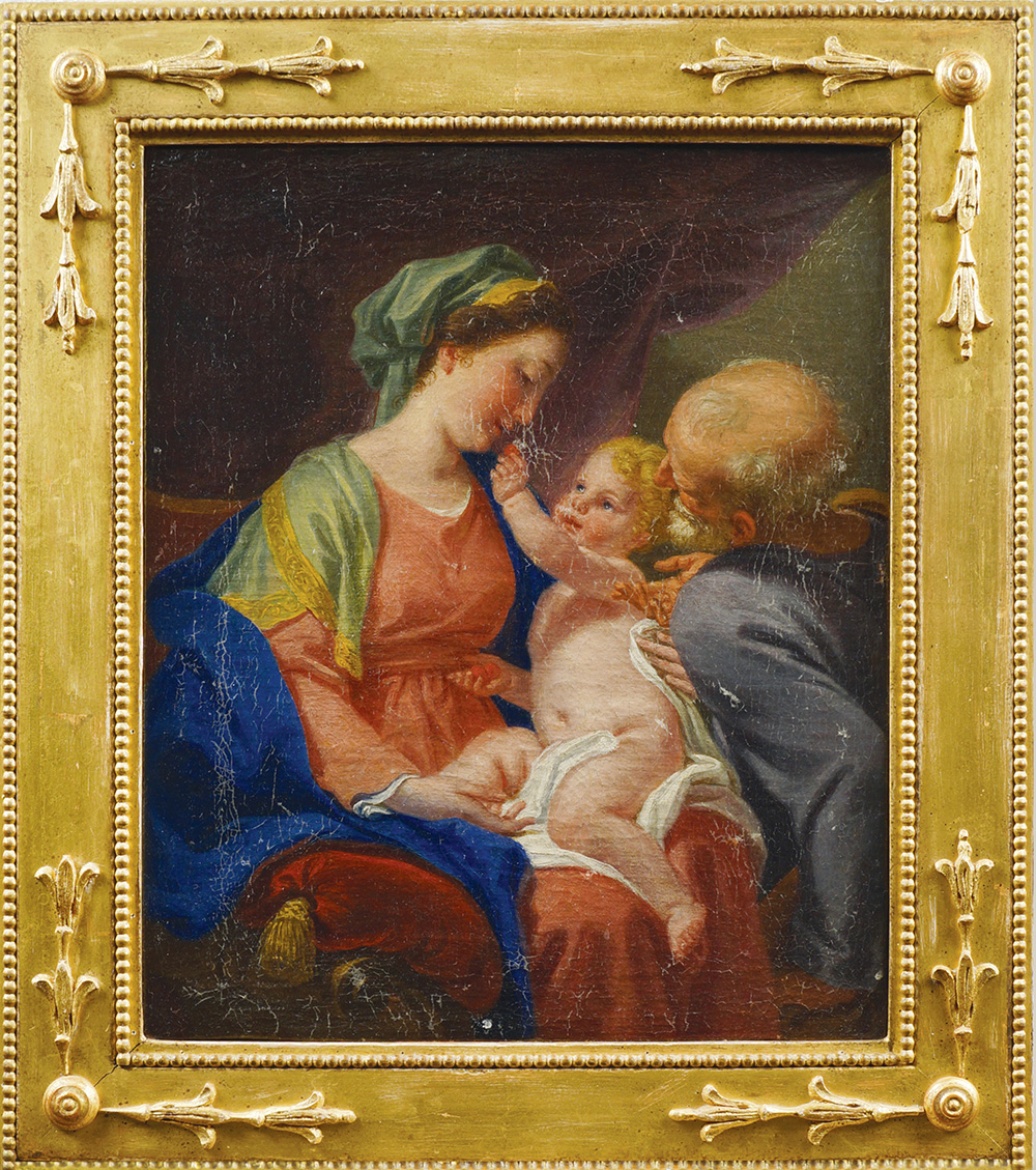 Ubaldo Gandolfi, seguace di fine XVIII - inizio XIX secolo 35x29 cm. "Sacra famiglia", olio su tela, entro cornice in legno dorato
