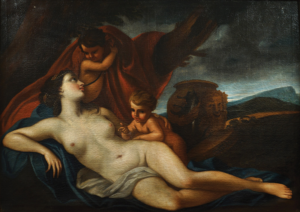 Antonio Bellucci, cerchia di Pieve di Soligo 1654 - 1726 121x169 cm. "Venere con amorini", olio su tela, entro cornice in legno dorato