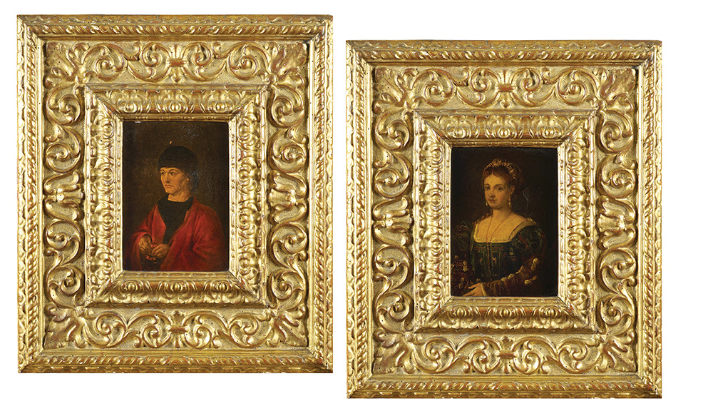 Coppia di ritratti XIX Sec. 15x20 cm. copie da Andrea del Castagno "Ritratto di nobiluomo " e da Tiziano "Isabella D'Este", entro cornici in legno dorato e intagliato, 44,5x39,5 cm.