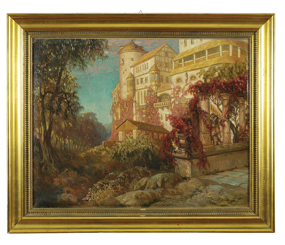 A. Lieblang Germania, attivo XIX Sec. 65x84 cm. "La Residenza", olio su tela, firmato in basso a sinistra, entro cornice in legno dorato