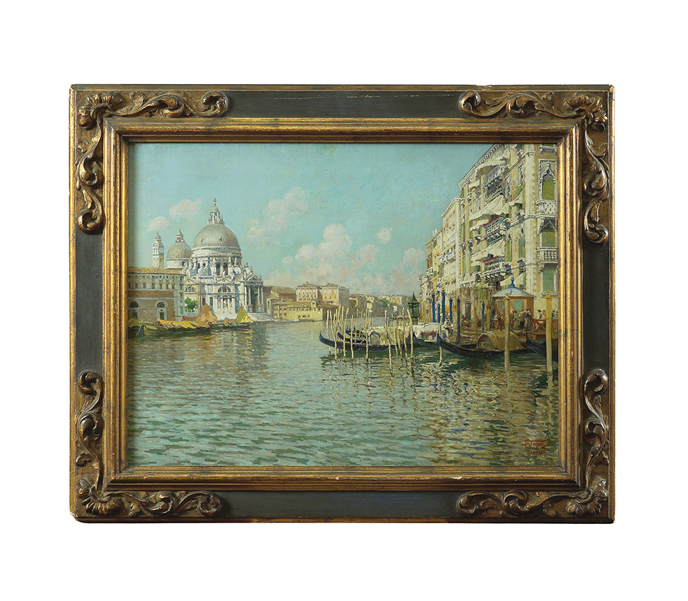 "Veduta del Canal Grande e di Santa Maria della salute", olio su tela entro cornice coeva in legno dorato e laccato, firmato in basso a destra R.Tafuri Venezia.