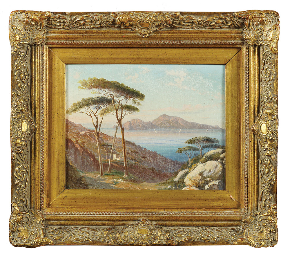 Pittore napoletano inizio XX Sec. 29x35 cm. "Veduta del golfo di Napoli", olio su tela, reca firma G. Carelli Napoli in basso a sinistra, entro cornice