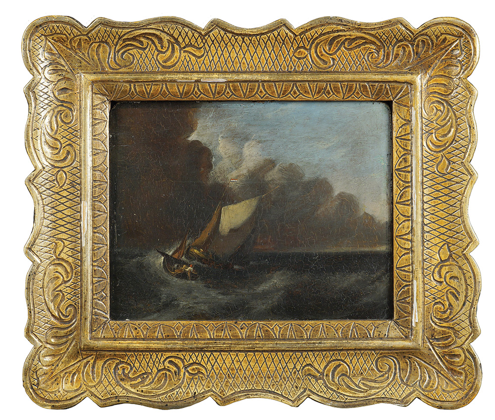 Scuola olandese XIX Sec. 14x18,5 cm. "Mare in tempesta", olio su tavola, entro cornice