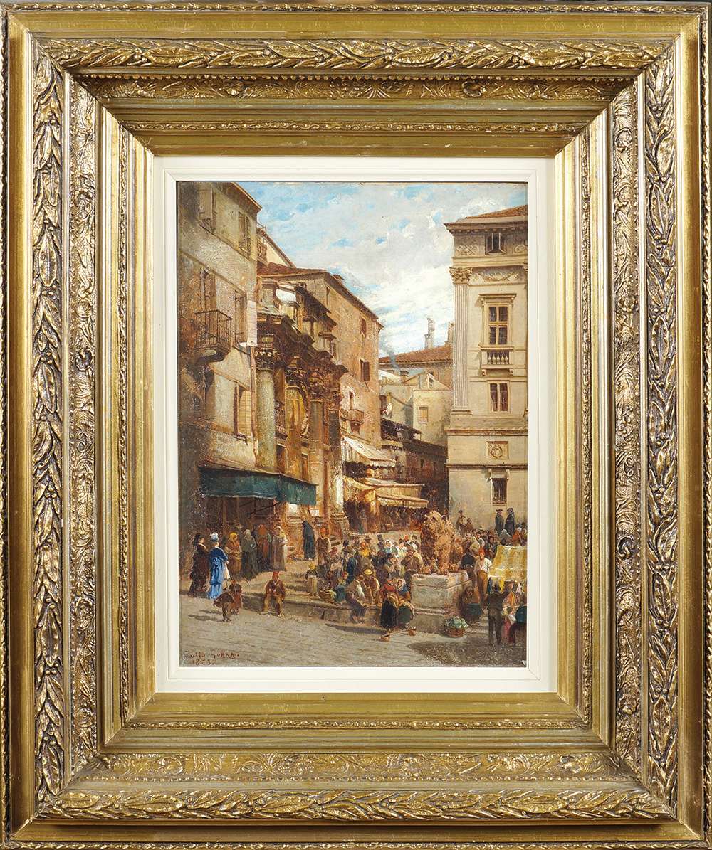 Giulio Gorra Cremona 1832 - Torino 1894 35x25 cm. "Scorcio di Roma con figure", olio su tela firmato e datato 1873 in basso a sinistra, entro cornice in legno dorato