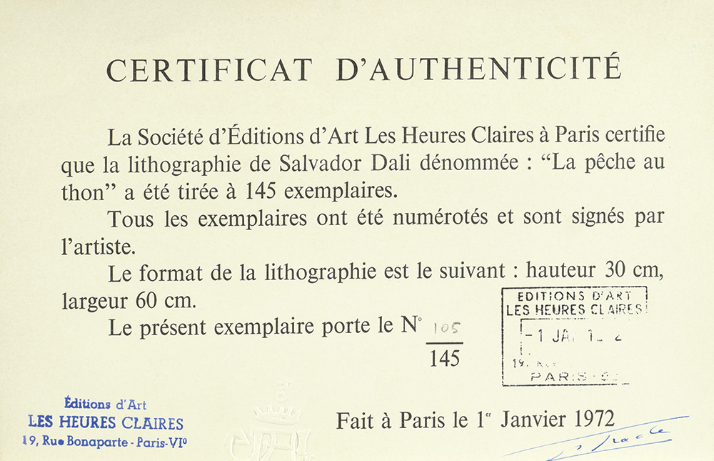 Salvador Dalì Figueres 1904 - 1989 30x60 cm. "La Pêche aux thons", litografia edizione Les Heures Claires Paris es.105/145, reca firma in basso a destra, tiratura e marchio a secco in basso a sinistra, entro cornice