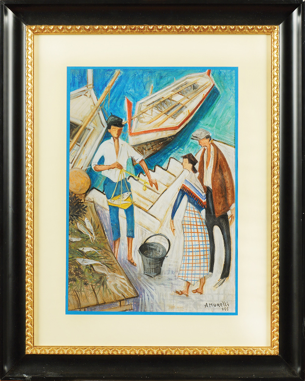 Alfonso Amorelli Siracusa 1898 - 1969 59x45 cm. "Mercato del pesce", tecnica mista su carta, firmata e datata in basso a destra 1956