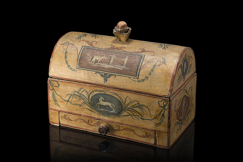 Scatola portagioie in cartone pressato dipinto in policromia a figure, profili virili e animali entro cornici a fiocchi e foglie (cm 22x18x13) Sec. XIX (difetti) 19th-century polychrome-painted cardboard box (defects)