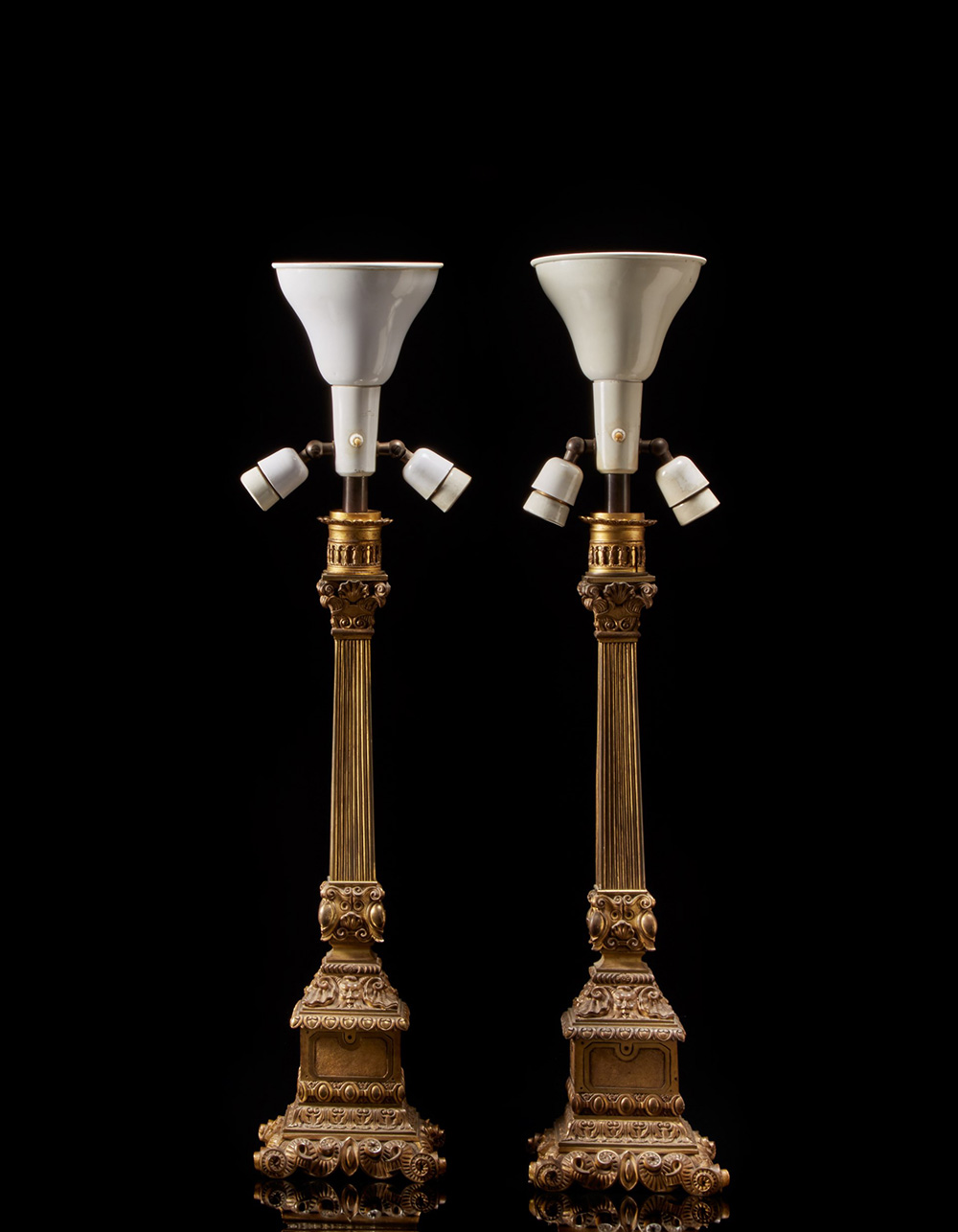 Coppia di candelieri in bronzo di forma classica con fusto a colonna scanalata, capitello e fasce decorate a volute, mascheroni e valve di conchiglia. Base squadrata sorretta da piedini a ricciolo (h. cm 65) (difetti, montati a luce elettrica in epoca posteriore) A pair of bronze candlesticks (defects, mounted as electric lights)