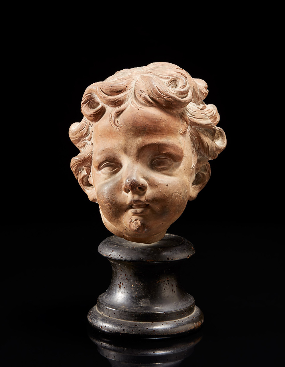 Maestro del sec. XVIII. Testa di fanciullo, scultura in terracotta, poggiante su base in legno tornito ed ebanizzato (cm 23) (minimi difetti)