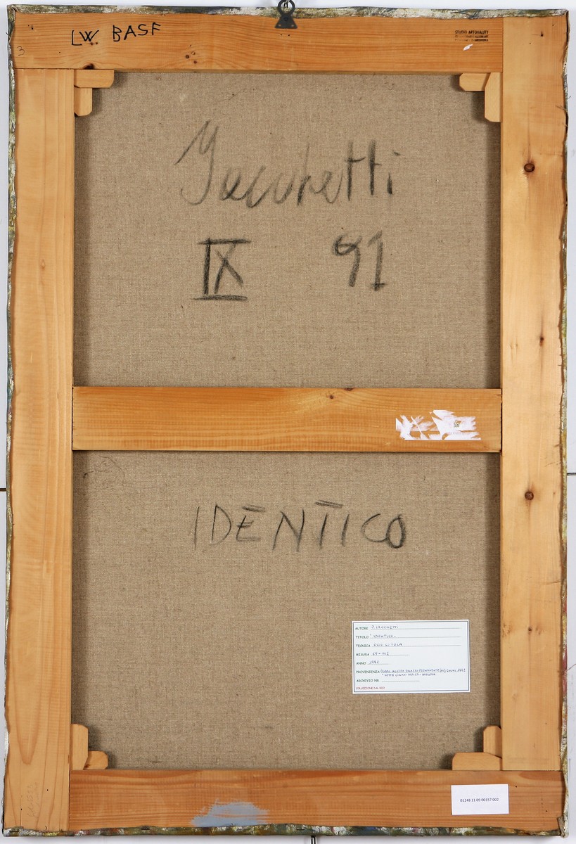 Pubblicazioni: "Sette giovani artisti", catalogo della mostra edito da Mazzotta, svoltasi presso il Palazzo della Permanente, Milano - Giugno 1992. Al retro firma, titolo, anno e cartiglio della galleria Artquality di Gorgonzola (MI).