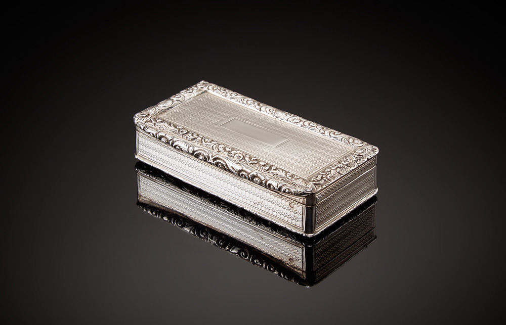 Tabacchiera in argento di forma rettangolare decorata a guillochË entro cornice sbalzata a motivi fitomorfi. Interno in vermeil. Argentiere Taylor&Perry. Birmingham, 1830 (cm 9x4,5x2) (gr 140 ca.) Rectangular silver snuff box. Taylor&Perry Silversmiths. Birmingham, 1830