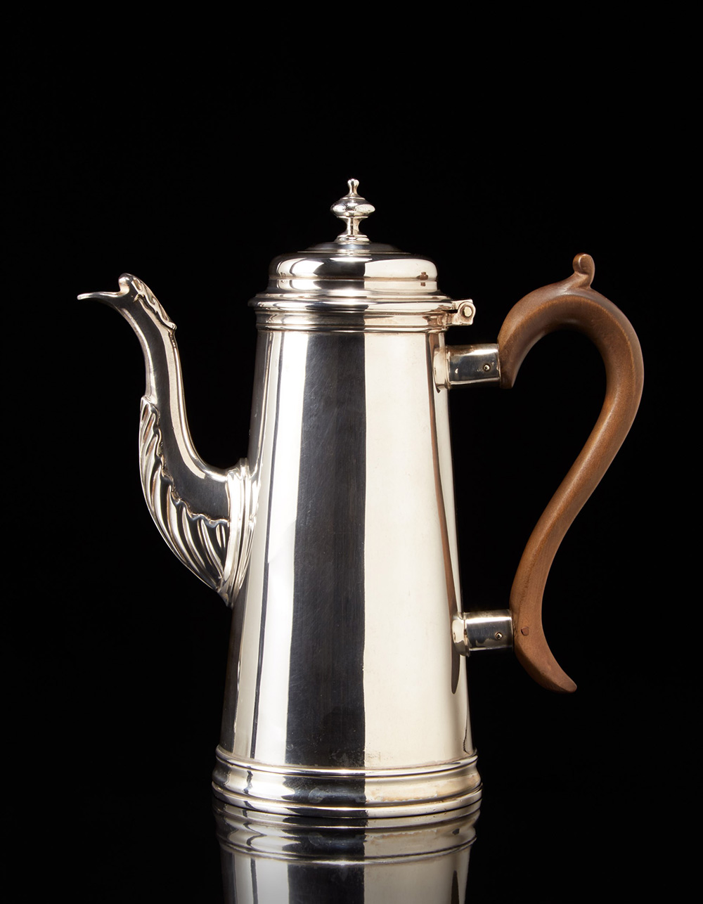 Caffettiera in argento a corpo troncoconico liscio, coperchio bombato con versatoio a collo di cigno e manico ad ansa in legno. Cimatura a trottola. Londra, 1898 (h. cm 18) (gr 450 ca.) Silver coffee pot. London, 1898