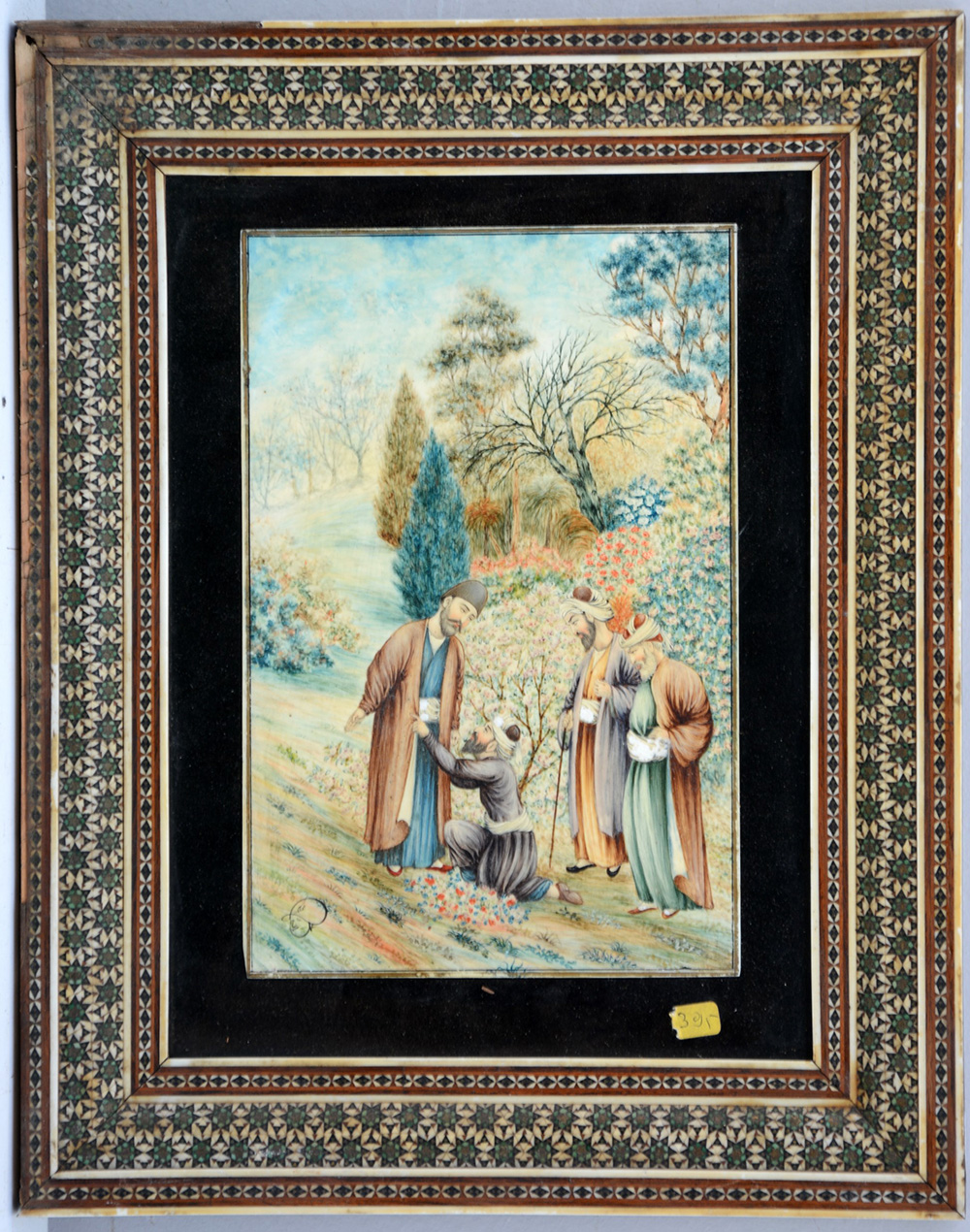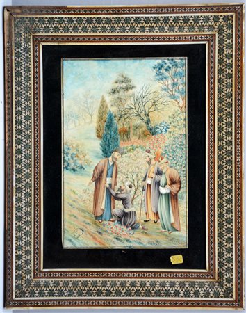 Arte Iraniana, fine sec. XIX. Dipinto su base in osso raffigurante personaggi islamici in un giardino fiorito. Firmata in basso a sinistra, etichetta al retro. In cornice intarsiata con osso e pietre dure (cm 19,5x13) (difetti alla cornice) Mohammed Khalil - Indian art, late 19th century. Oil on bone depicting Islamic figures. Signed at bottom left, label to reverse. Framed (defects)