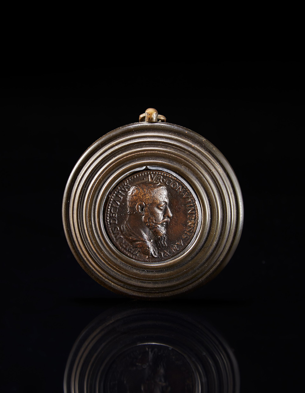 Giovanni da Cavino, Sesterzio raffigurante Tiberio Deciano, 1548 (d. cm 2) Montato in cornice in legno ebanizzato Giovanni da Cavino, Sesterzio coin depicting Tiberio Deciano, 1548. Framed