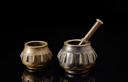 Lotto composto da due mortai in bronzo di cui uno con pestello decorati a costolature. Sec. XVII (difetti) Lot comprising two 17th-century bronze mortars (defects)