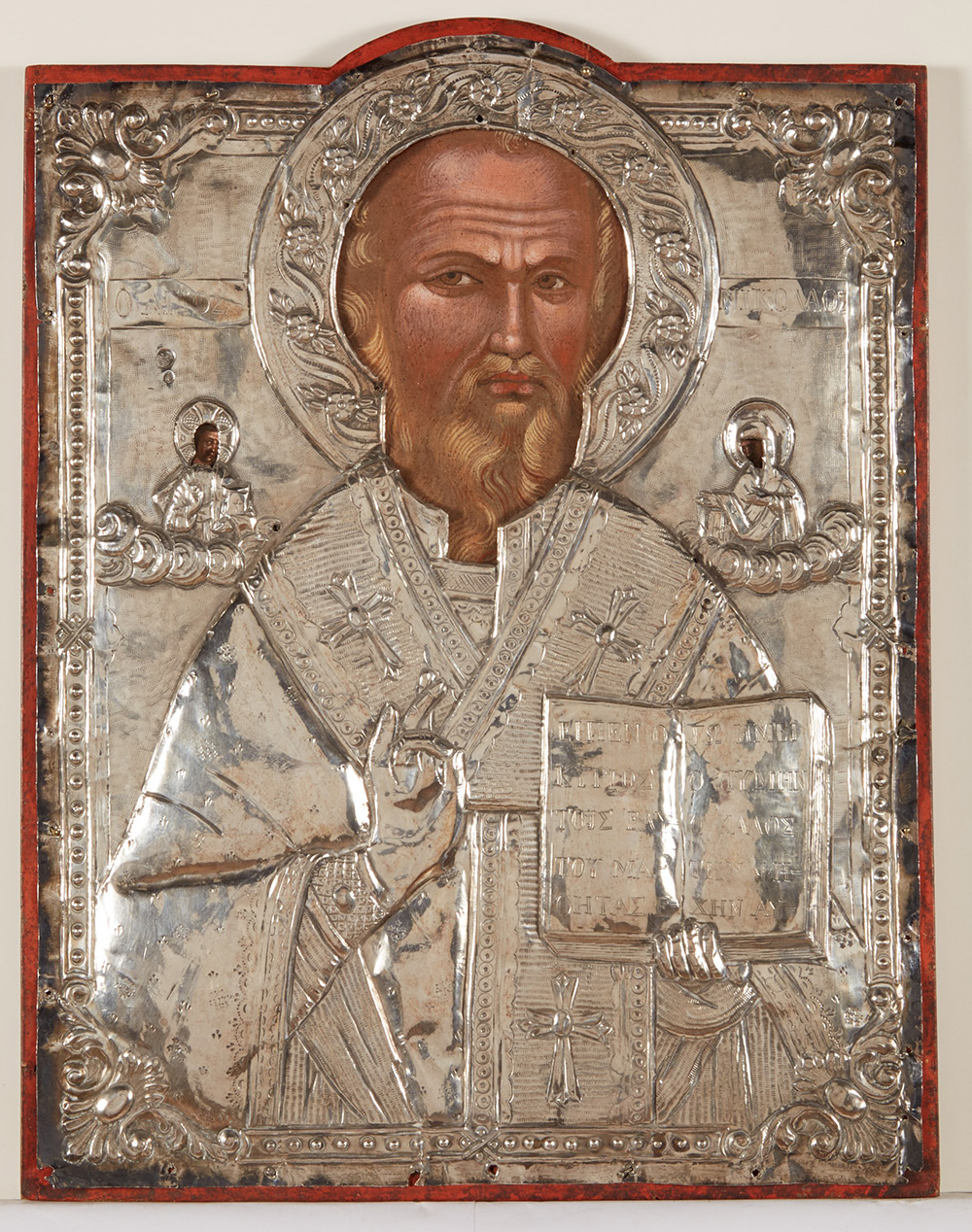 Icona raffigurante San Nicola e Santi a tempera su tavola con riza in argento sbalzato. Impero Ottomano, inizio sec. XX (cm 37,5x28,5) In cornice di epoca posteriore (difetti) Icon depicting Saint Nicholas and other saints, tempera on panel, silver riza. Ottoman Empire, early 20th century (defects)