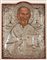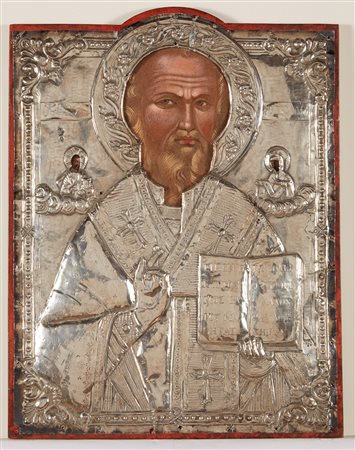 Icona raffigurante San Nicola e Santi a tempera su tavola con riza in argento...