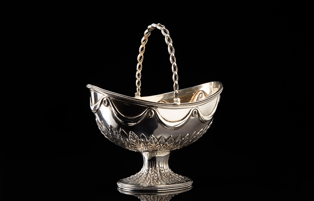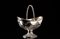 Cestino in argento a forma di barca con manico e piede ovale decorato a...