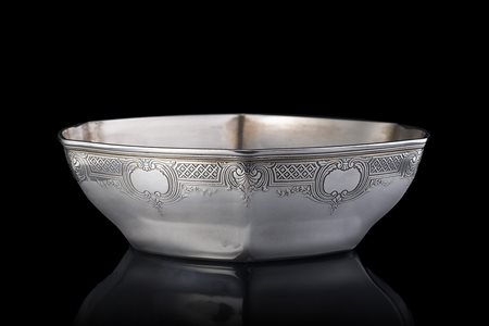 Cestino esagonale in argento con fascia superiore decorata a graticci e riserve entro volute. Stati Uniti. Tiffany & Co (d. cm 23) (gr 500 ca.) Hexagonal silver basket. Tiffany&Co