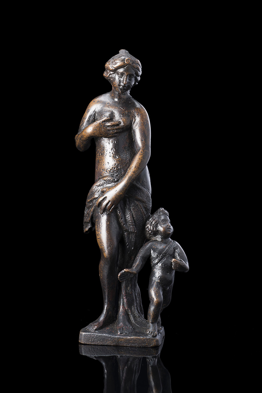 Artista del sec. XVI "Donna con Bambino" scultura in bronzo (h. cm 8) (difetti) 16th-century artist "Woman and Child" bronze sculpture (defects)