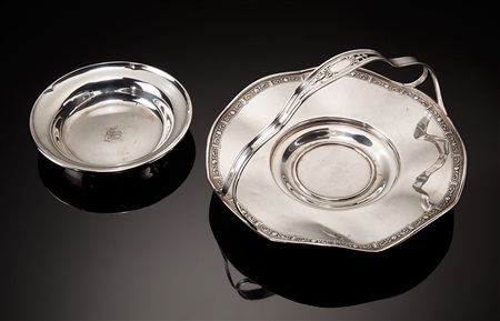 Lotto in argento composto da un cestino con manico e bordo mosso decorato con...
