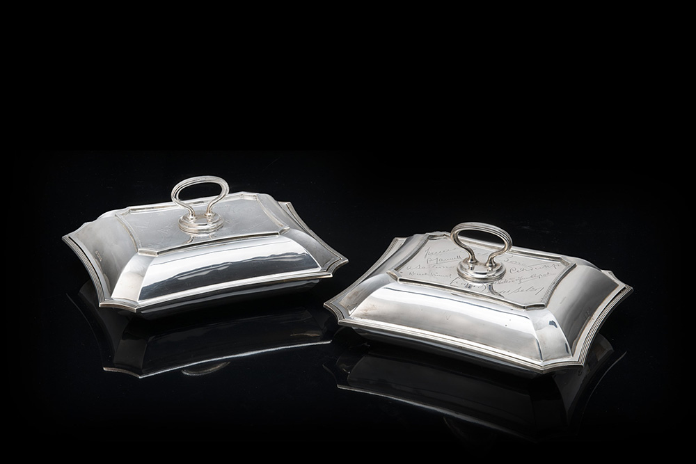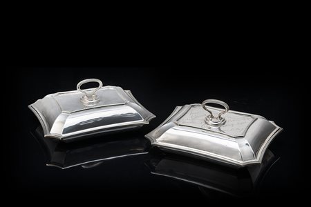 Coppia di legumiere in argento di forma rettangolare e bordo falcato. Modanature incise con nomi sul coperchio. Prese a maniglia. Londra, 1932 (cm 26,5x23) (gr 2300 ca.) A pair of silver entrÈe dishes. London, 1932
