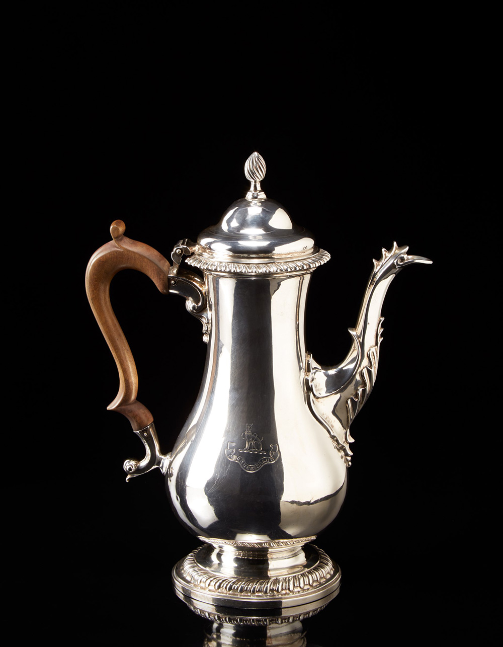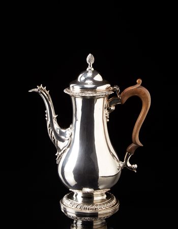 Caffettiera in argento con corpo a balaustro liscio, coperchio a doppia bombatura decorati con fascia e bordura baccellate e motto "a cruce salus" inciso. Versatoio a collo di cigno. Cimatura a fiamma e manico in legno a doppia voluta. Argentiere LH in corsivo. Londra, 1768 (h. cm 26) (gr 720 ca.) Silver coffee pot. London, 1768
