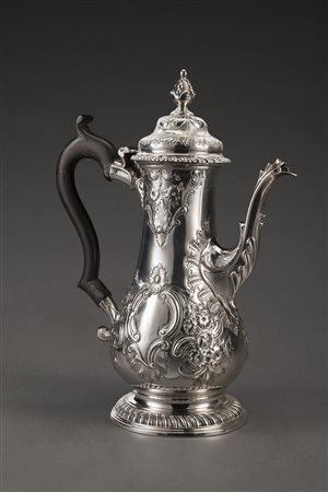 Caffettiera in argento con corpo sbalzato a fiori e volute fogliate, beccuccio e pinnacolo stilizzati, ansa in legno ebanizzato. Marchi di Londra 1765 (h. cm 29) (gr lordi 950) Silver coffee pot. London, 1765