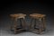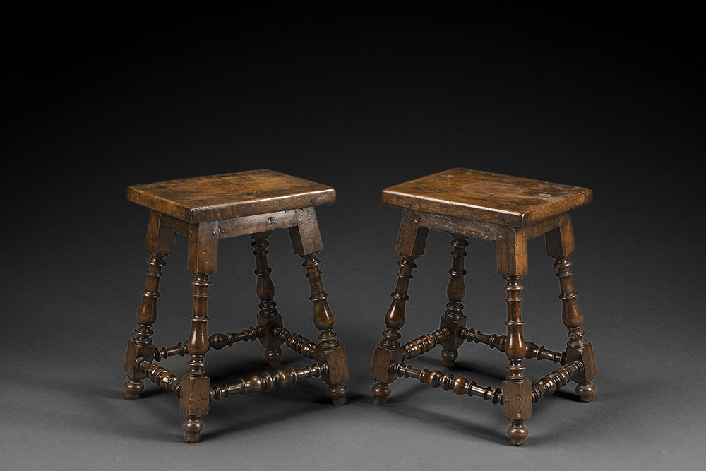Coppia di panchetti a rocchetto in noce con sedute squadrate, gambe e traverse tornite. Sec. XVII (cm 40x50x30) (restauri) A pair of 17th-century wood stools (restorations)