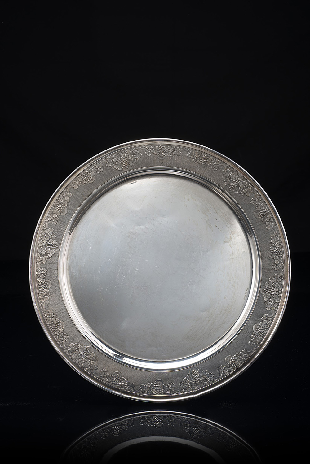 Vassoio in argento di forma circolare con tesa decorata a tralci d'uva su...