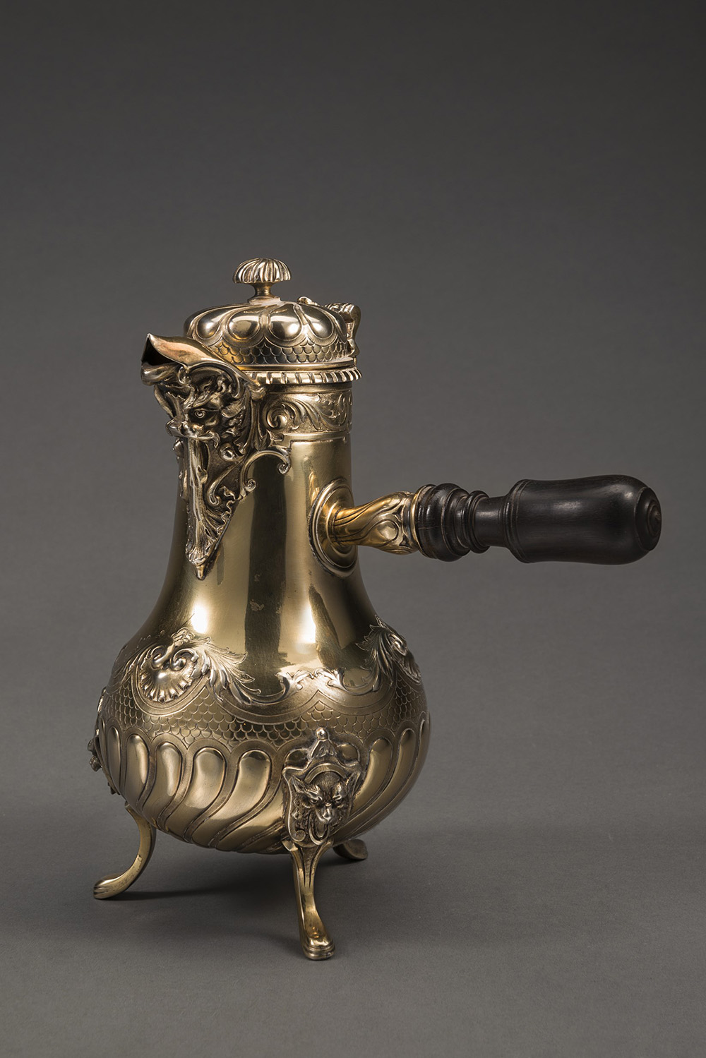 Lot 863 | Cioccolatiera in vermeille con corpo sbalzato e inciso a volute e motivi...