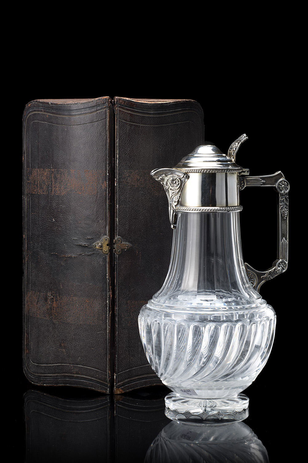Brocca in argento e vetro decorata a motivi animali e floreali. Entro custodia rivestita in pelle. Londra, 1885 (h. cm 25) (lievi difetti) Silver and glass jug. London, 1885. With case (minor defects)