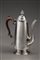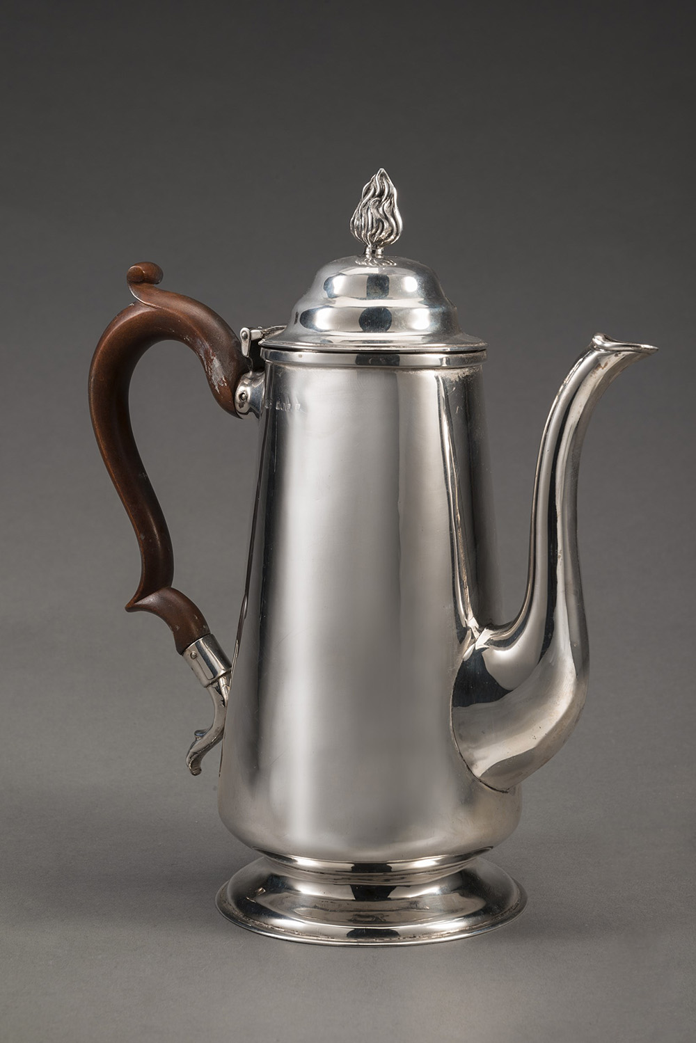 Caffettiera in argento a corpo liscio con pinnacolo a fiamma, ansa in legno...