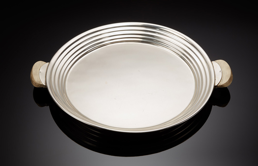 Vassoio in argento di forma circolare con cavetto gradinato e due manici stondati in osso. Italia, prima met‡ sec. XX (largh. cm 52) (gr 2000 ca.) (difetti) Round silver tray. Italy, first half of 20th century (defects)