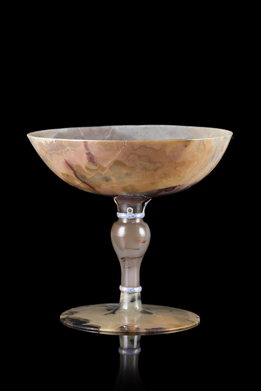 Antica coppa in agata con fusto tornito decorato con ghiere in metallo smaltato nei toni dell'azzurro (h. cm 12) (difetti e restauri) Antique agate tazza (defects and restorations)