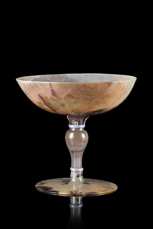 Antica coppa in agata con fusto tornito decorato con ghiere in metallo...