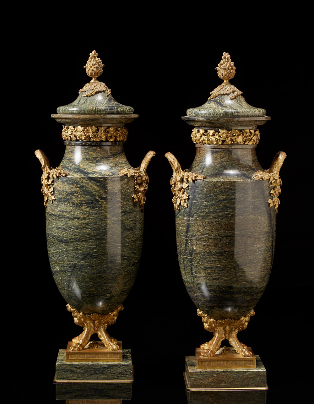 Coppia di vasi a urna in marmo verde con coperchi, anse ed elementi decorativi in bronzo, basamento quadrato con piedi a zampa di grifone, fine sec. XIX (h. cm 55) (diffusi restauri e felature ai marmi)