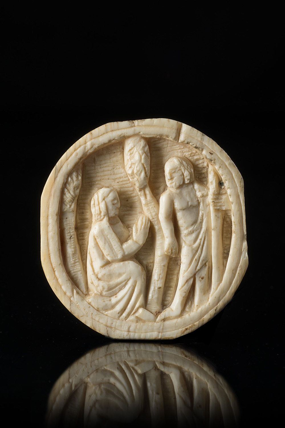 Arte del sec. XV "Noli me tangere" scultura in avorio (3,5x3,2) Incisa al...