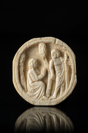Arte del sec. XV "Noli me tangere" scultura in avorio (3,5x3,2) Incisa al retro con fiore (difetti e mancanze) 15th-century art "Noli me tangere" ivory sculpture (defects and losses)