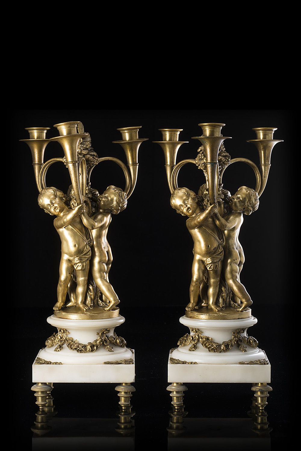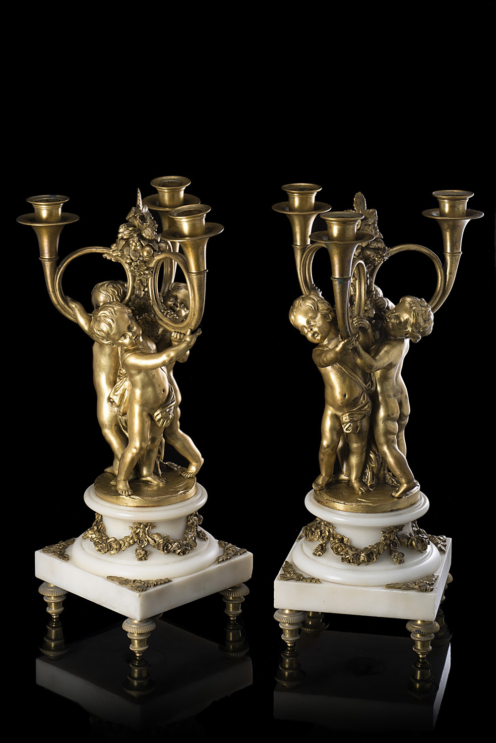 Coppia di candelabri a tre fiamme in bronzo decorati con figure di putti e festoni, montati su basi in marmo (h. cm 40) Fine sec. XIX (lievi difetti) A pair of bronze candelabra. Late 19th-century (minor defects)