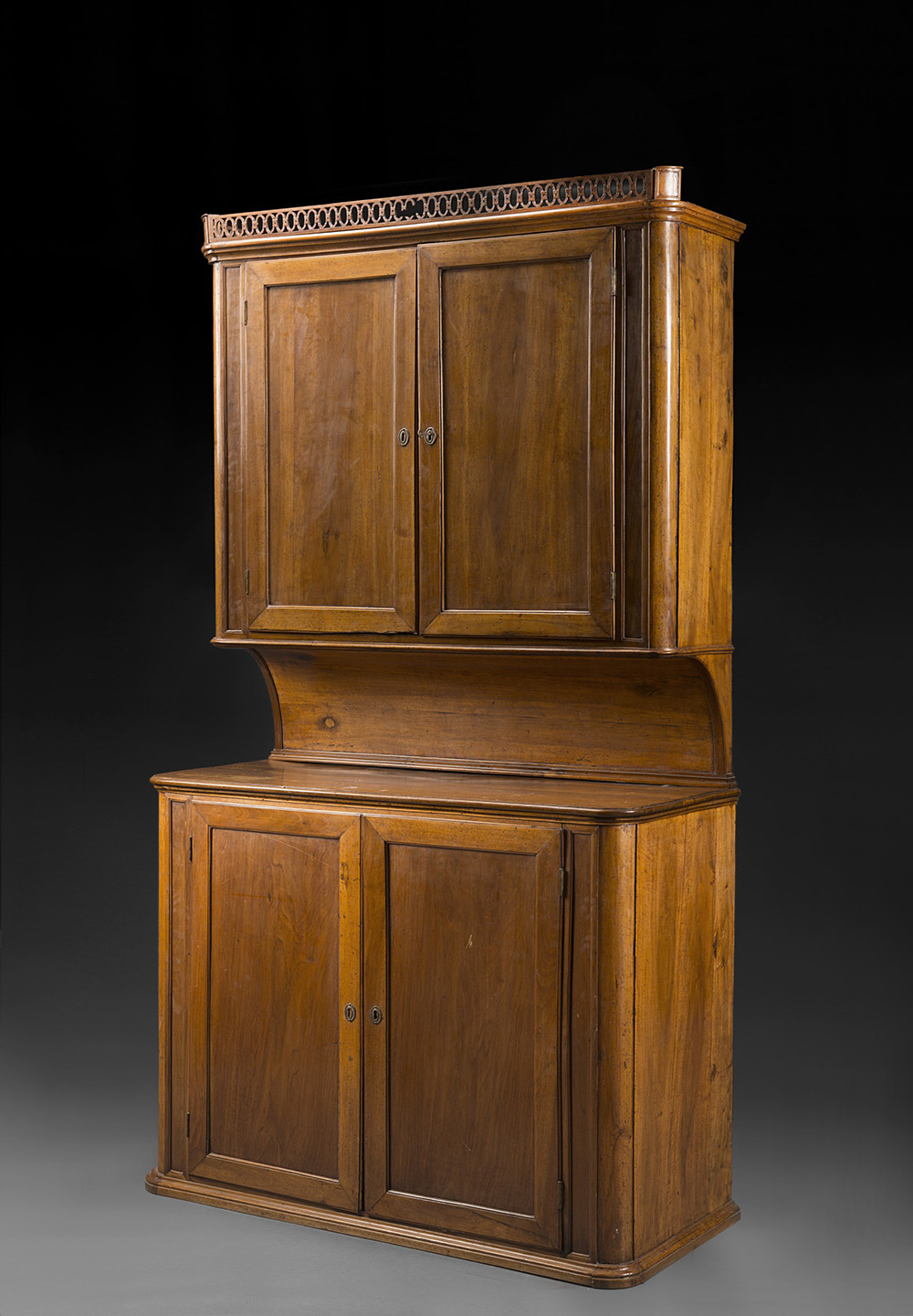 Mobile con alzata in noce con parte superiore a due ante, decorata con ringhiera traforata. Parte inferiore a due sportelli. Veneto, met‡ sec. XIX (cm 128x234x53) (difetti) Walnut sideboard cabinet. Veneto, mid-19th century (defects)