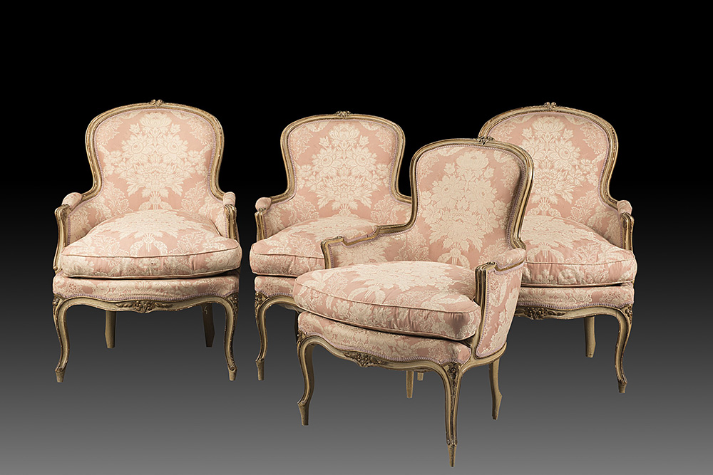 Gruppo di quattro poltrone in legno laccato con profili dorati. Cimasa e fascia intagliate a motivi floreali Group of four parcel-gilt and lacquered wood armchairs