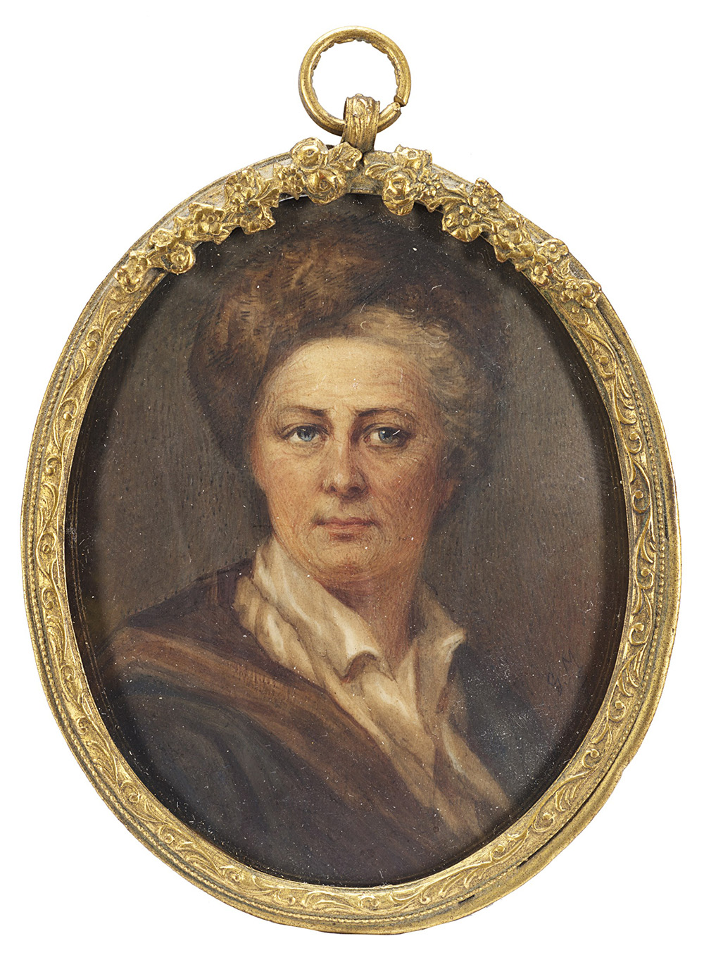 Maestro del sec. XIX "Ritratto di uomo con cappello di pelliccia" miniatura ovale su avorio (cm 8x6,5) Siglata GMS in basso a destra 19th-century master "Portrait of a man with a fur hat" miniature on ivory. Signed GMS at bottom right