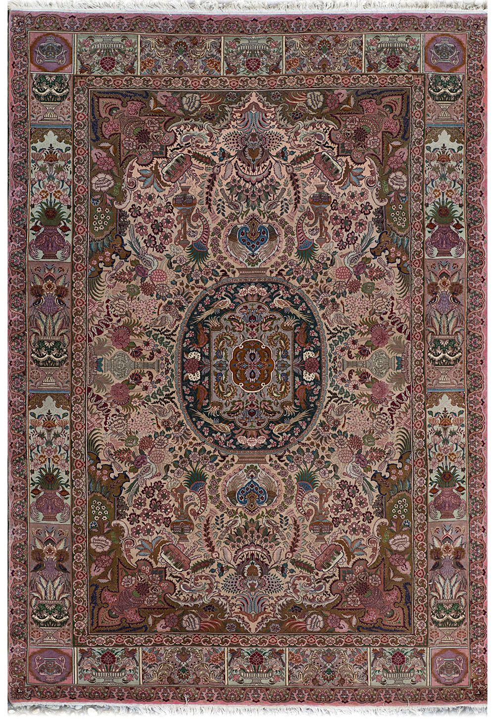 Tappeto Tabriz, Persia recente manifattura. Annodatura fine in lana e seta. Disegno pittorico con medaglione verde su fondo rosa. Ricca decorazione con fiori, animali, acquamanili, cornucopie e cartigli decorati con fiori, cm 292x202 (lievi difetti) Tabriz carpet, Persia, recent manufacture (minor defects)
