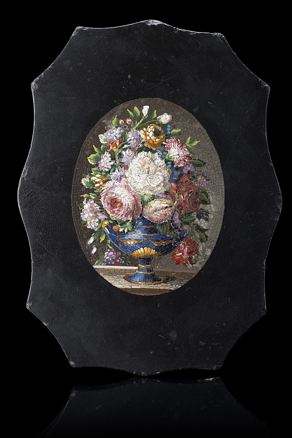 Micromosaico raffigurante vaso con fiori montato su placca di pietra di paragone. Roma, fine sec. XIX (cm 11x8,5) (lievi difetti e restauri) Provenienza: Collezione Petochi, Roma 19th-century Roman micromosaic on basanite plaque (minor defects and restorations)