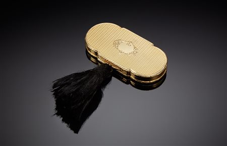 Portacipria in oro 18 kt e metallo dorato di forma rettangolare sagomata decorata a guillochÈ, bordure godronate e riserva centrale entro volute fitomorfe. Italia, fine sec. XIX-inizio sec. XX (cm 8,6x4,5) (gr lordi 117 ca.) (lievi difetti) Gold and gilt metal compact. Italy, 19th/20th century (minor defects)