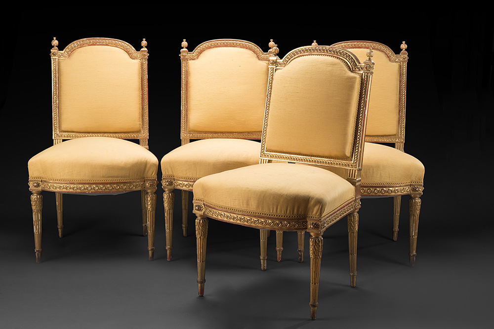 Gruppo di quattro sedie in legno dorato, intagliate a motivi vegetali e perlinature, schienale sagomato decorato con pinnacoli. Gambe tornite e scanalate. Sec. XIX Group of four carved giltwood chairs. 19th century