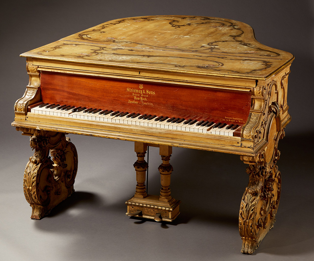 Pianoforte mezza coda Steinway & Sons. Cassa barocca in legno laccato decorato in policromia e dorature a volute e fiori. Gambe e fascia con applicazioni in legno dorato e scolpito a motivi vegetali. Tastiera con tasti in avorio. 1850 - 1860. Modello americano, numero matricola 68527 (difetti e restauri) Lacquered wood grand piano by Steinway & Sons. 1850 - 1860. Serial number 68527 (defects and restorations) La Steinway & Sons attesta ufficialmente: "The serial number 68527. The instrument is listed in our records to have been manufactured in our Hamburg factory and shipped to the decorator BembÈ in Mainz for the outer decoration on 29.4.1891. The final destination was the "Schnelldampfer F¸rst Bismarck", a prominent ship of the time." Commissionato dal noto costruttore di mobili e decoratore Philipp Anton BembÈ, attivo tra la fine del XIX e XX secolo, noto soprattutto per la realizzazione degli arredi della suite imperiale ed altre stanze in stile barocco del castello di Peles, fu prodotto dalla Steinway &Sons nello stabilimento di Amburgo in data 29.4.1891 Quest'importante pianoforte fu progettato e realizzato per decorare la famosa nave Schnelldampfer Furst Bismark, una delle pi˘ grandi ed importanti navi tedesche del tempo. Il battello veloce "Principe Bismarck" venne costruito presso il cantiere Vulkan a Stettino; nel 1905 fu venduto alla Russia e fu utilizzata come nave passeggeri. Nel 1909 la nave venne acquistata dall' Austria con il nome di "Gea" ed entrÚ a far parte della flotta militare. Durante la prima guerra mondiale venne utilizzata come nave díappoggio per sottomarini e come chiatta. Nel 1920 fu venduta alla compagnia di navigazione Cosulich di Trieste e cambiÚ il nome in "San Giusto" quindi, nel 1924, venne ceduta ad una compagnia di demolizione italiana per essere definitivamente smantellata.