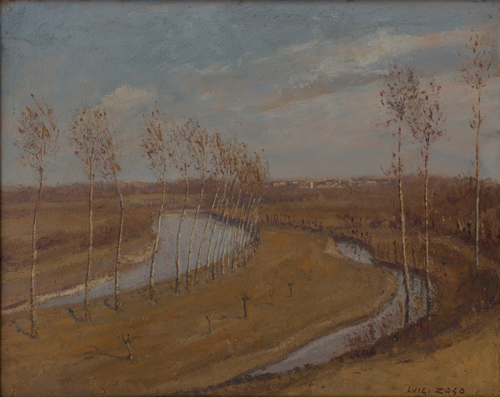 LUIGI ZAGO (1894-1952) Risveglio della natura Olio su tavola cm 44x55,5 Firma...